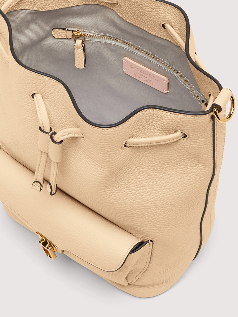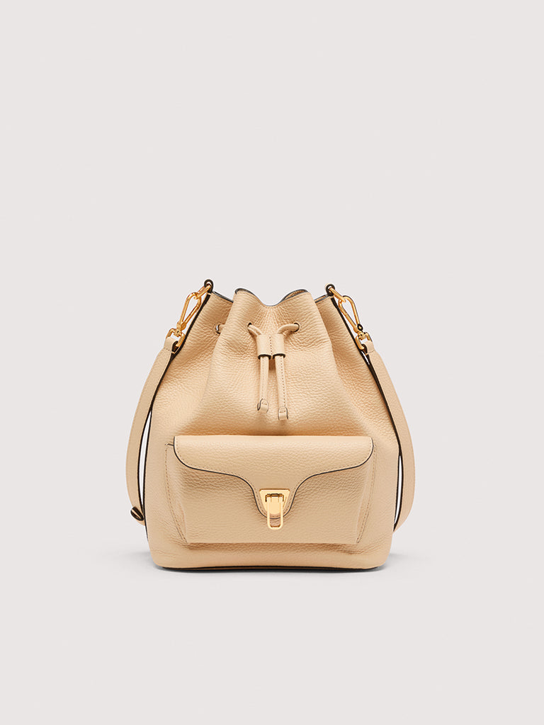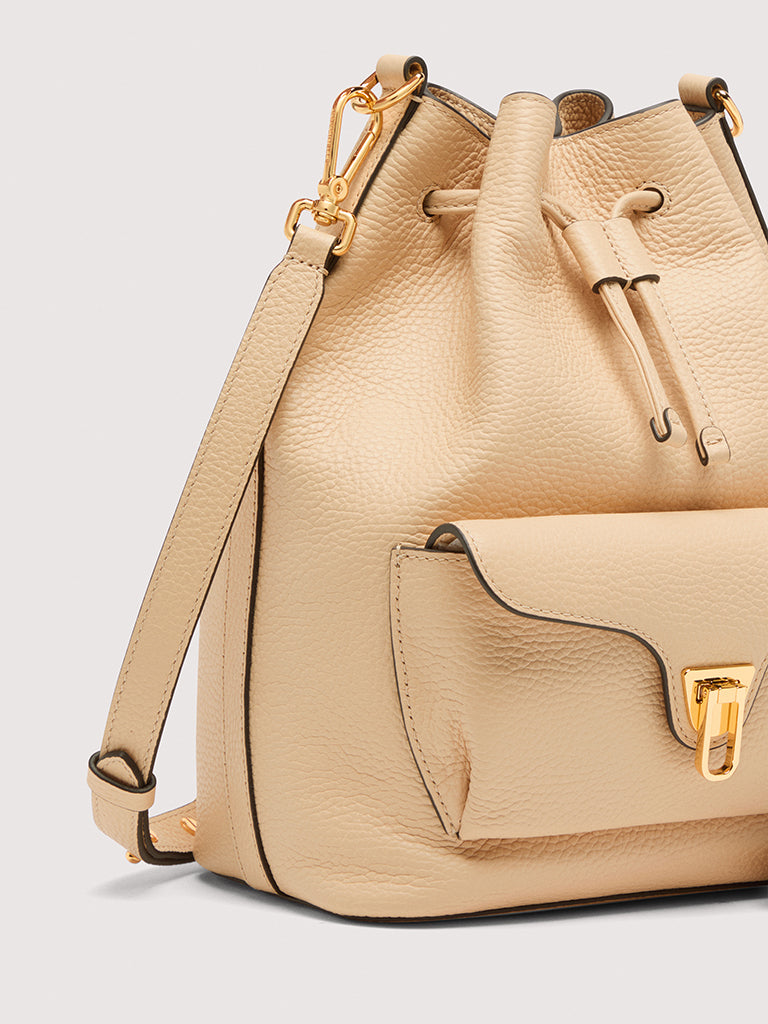 Coccinelle Beat is one of the brand’s iconic lines: the distinctive flap closure with plectrum is the symbol of Coccinelle’s identity, reimagined for this collection with elegant, modern functionality. This bucket bag with leather shoulder strap can be carried in two ways, and is a perfect mix of structure and softness, practicality and contemporary design. This model is made with leather processed using specialised machines and then tumbled to maintain its softness. This is a very robust, easy to clean leather, making it ideal for everyday use.