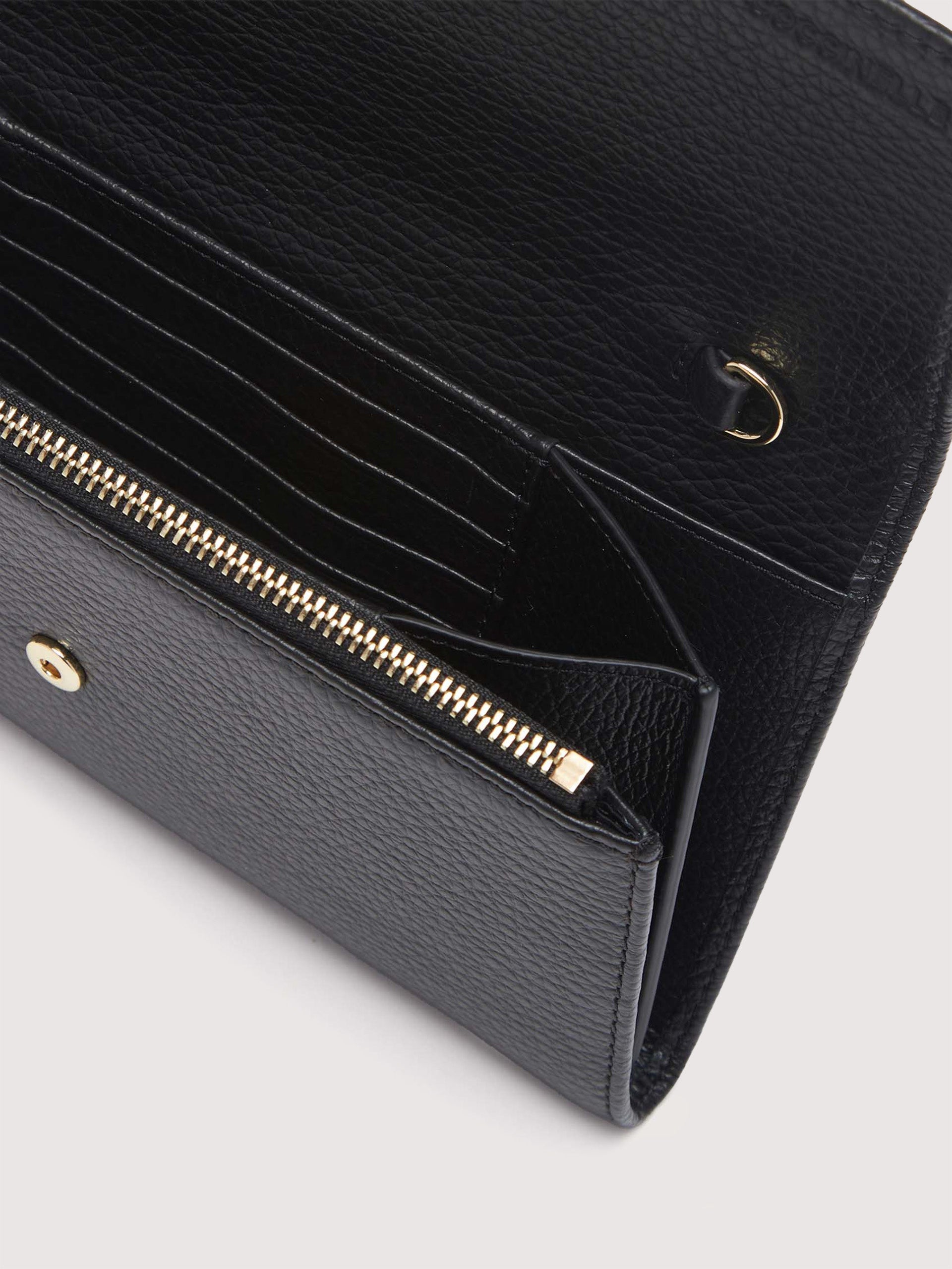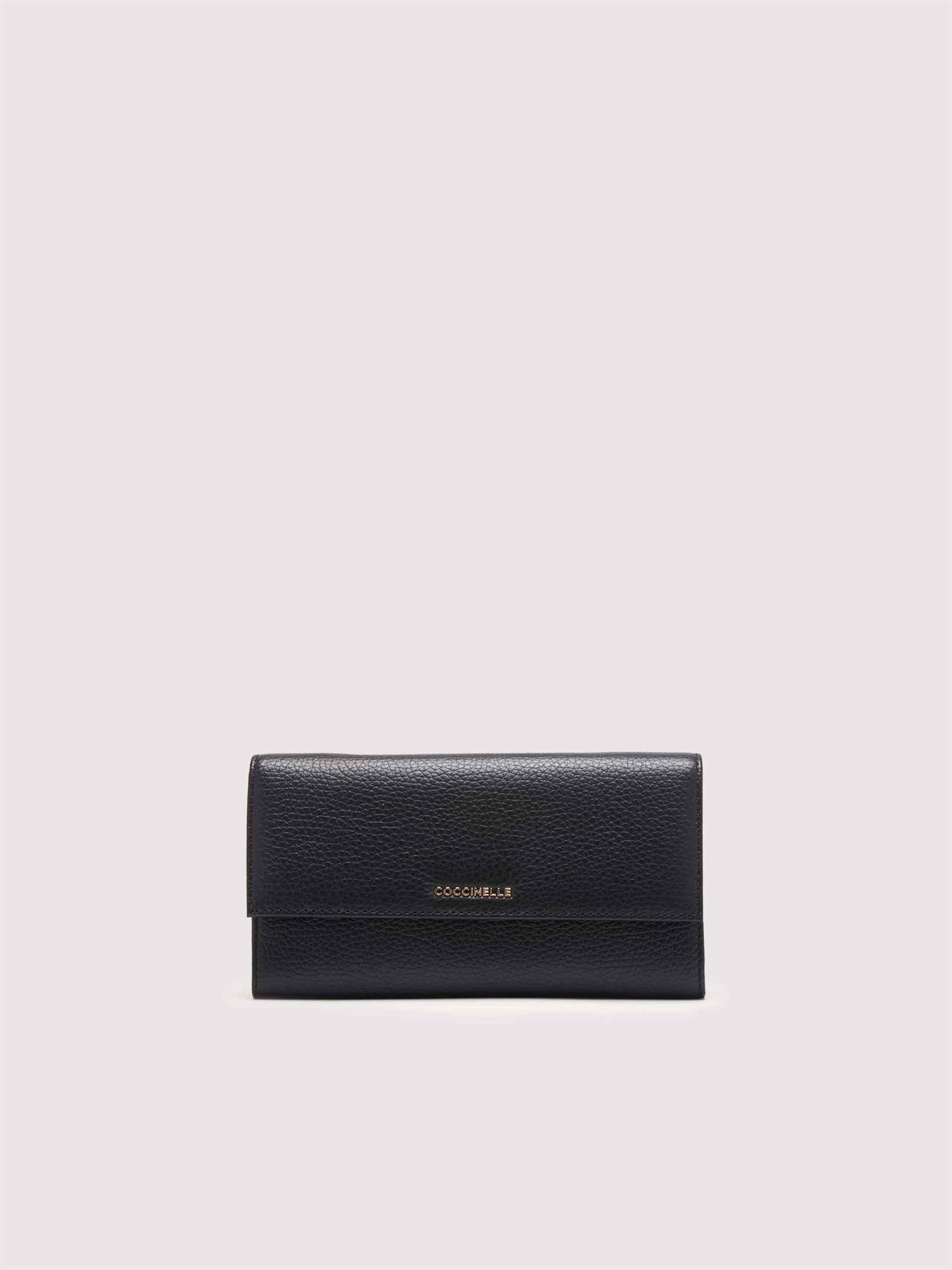 This wallet with a little strap from the Metallic line is embellished with the metal Coccinelle logo. Practical and functional, its space is well organised to tote all your necessary items neatly and carefully. In addition, the comfortable adjustable leather shoulder strap makes it perfect for wearing across the body. This model is made with leather processed using specialised machines and then tumbled to maintain its softness. This is a very robust, easy to clean leather, making it ideal for everyday use. RFID protection.