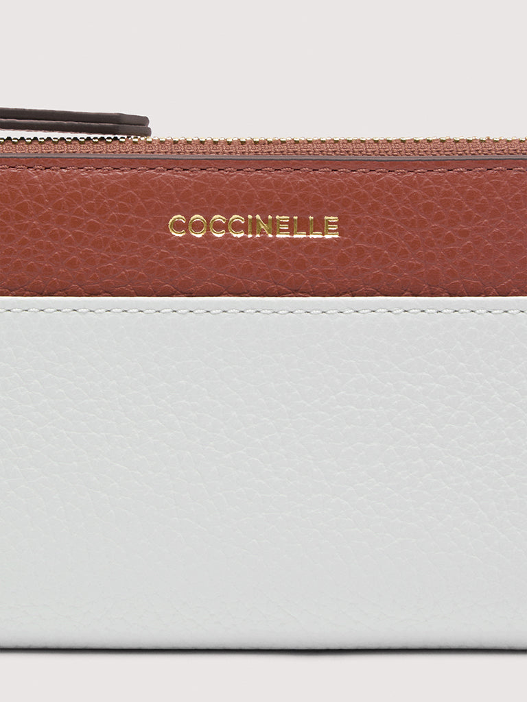 This slim bifold wallet from the Coccinelle Loreen line is elevated by a tricolour design and the Coccinelle logo. Its space is well organised for storing your essentials neatly and carefully. This model is made with leather processed using specialised machines and then tumbled to maintain its softness. This is a very robust, easy to clean leather, making it ideal for everyday use. RFID protection.