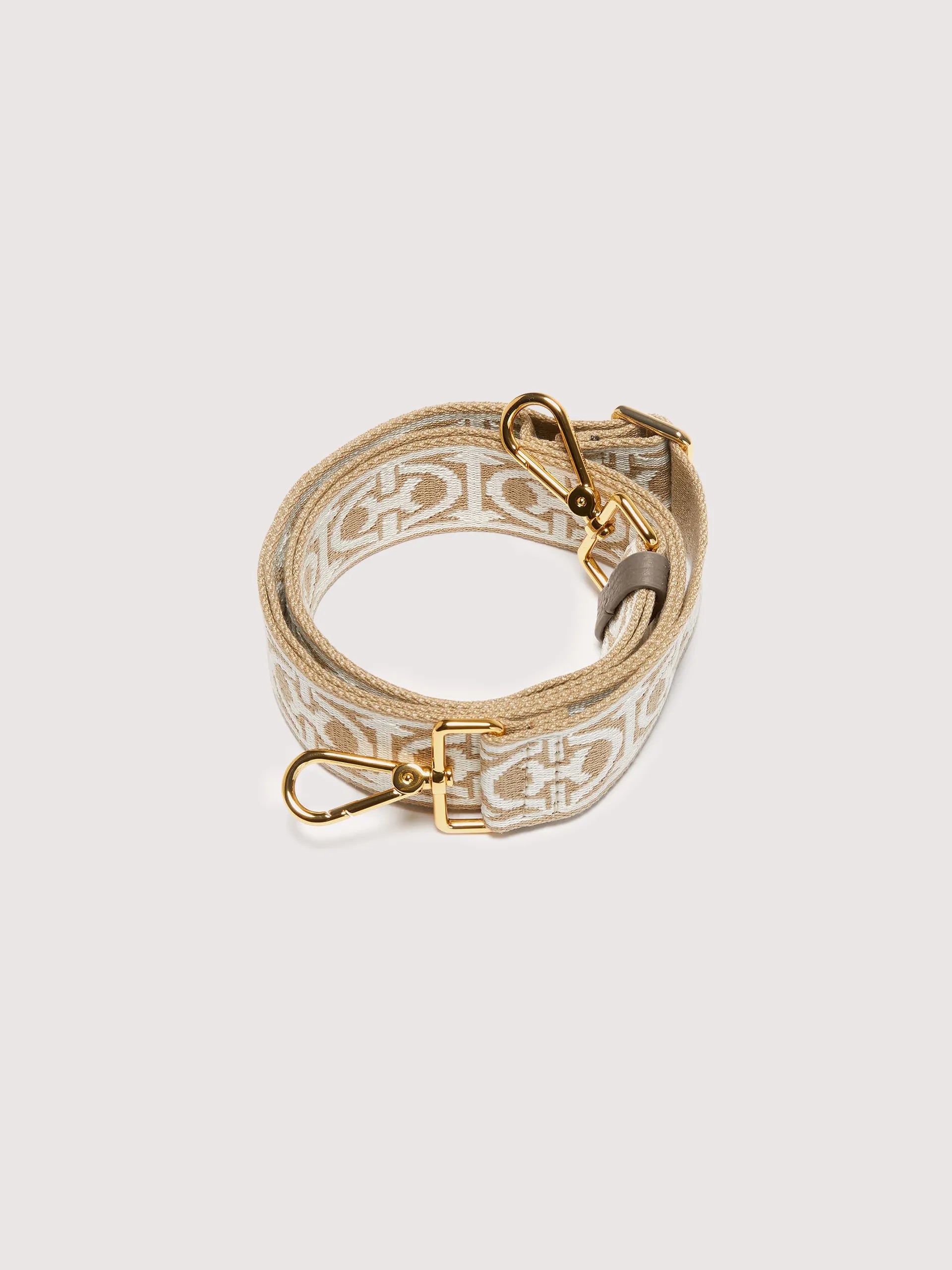 Jacquard fabric shoulder strap with Monogram Coccinelle pattern. Adjustable with sliding ring. Perfect for personalising your bag. This model is made in 100% cotton fabric. The jacquard monogram fabric is made using a special loom capable of carrying out complex designs. Once finished, this fabric is further processed and provided with an anti-fraying solution on the back and anti-drip solution on the visible side. Clean with a white cotton cloth slightly moistened with water and leave to air dry.