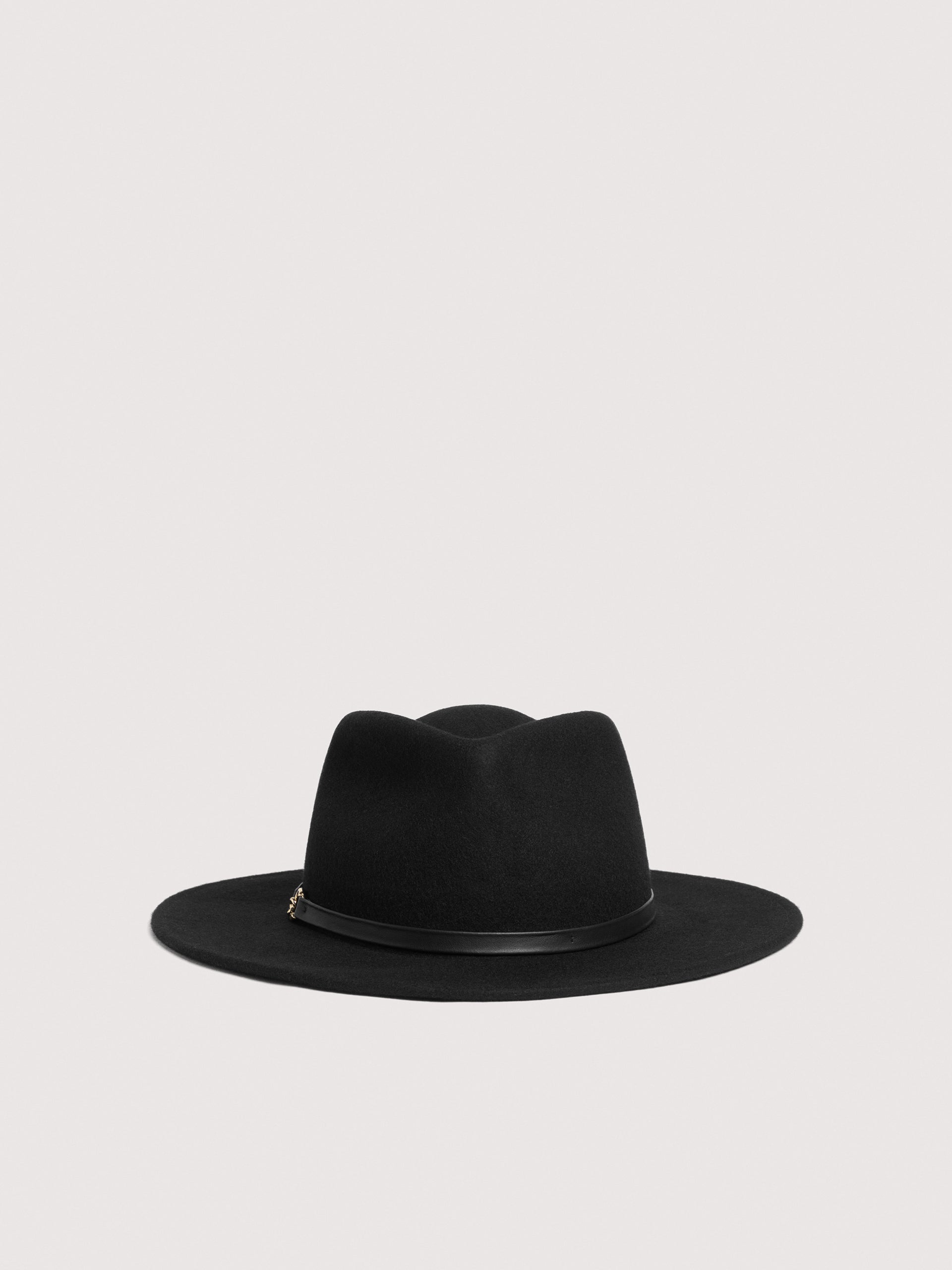 Fedora-style wool hat with an elegant, contemporary shape, featuring a leather strap and the C-Me logo.