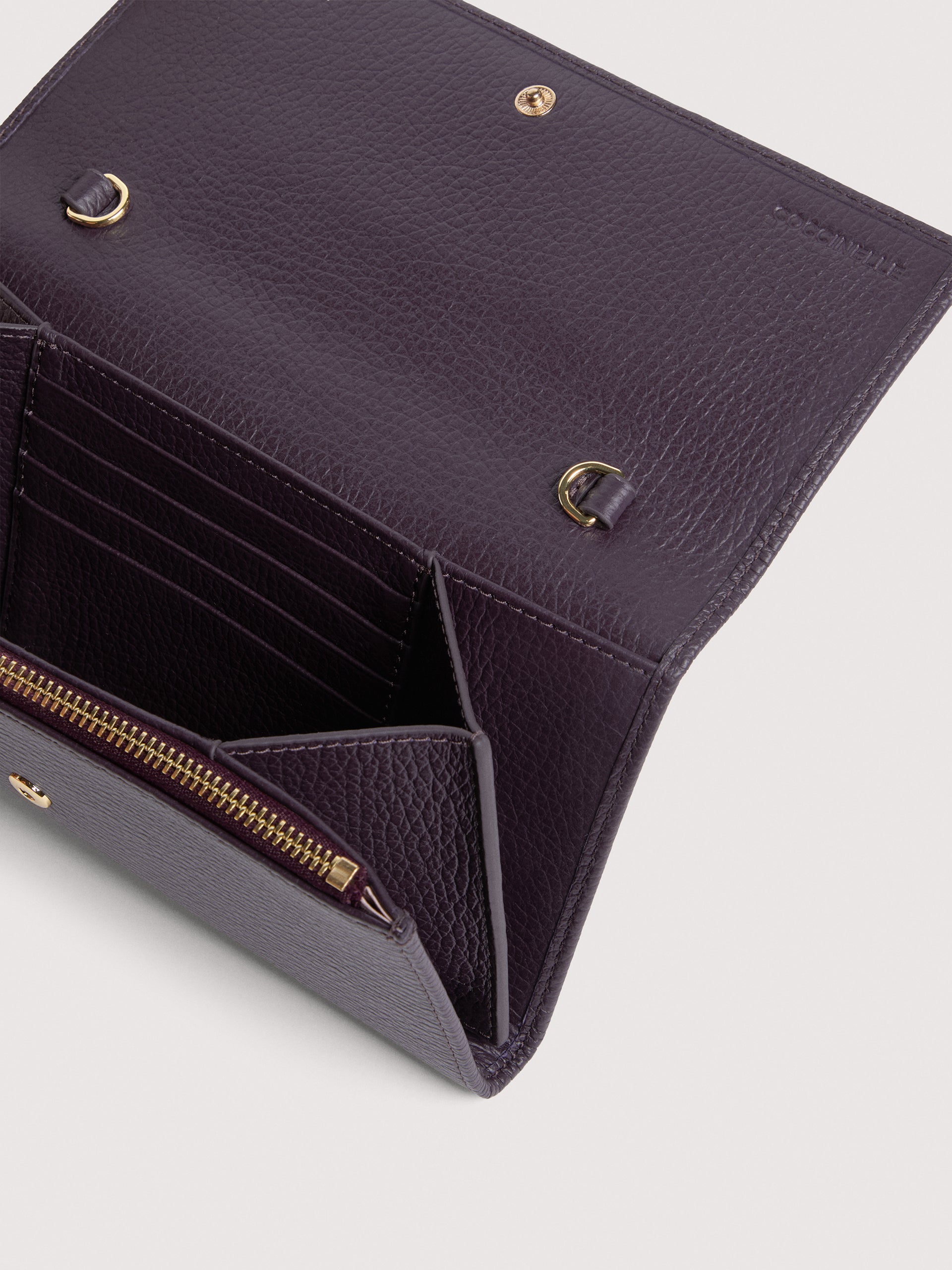 This wallet with a little strap from the Metallic line is embellished with the metal Coccinelle logo. Practical and functional, its space is well organised to tote all your necessary items neatly and carefully. In addition, the comfortable adjustable leather shoulder strap makes it perfect for wearing across the body. This model is made with leather processed using specialised machines and then tumbled to maintain its softness. This is a very robust, easy to clean leather, making it ideal for everyday use. RFID protection.
