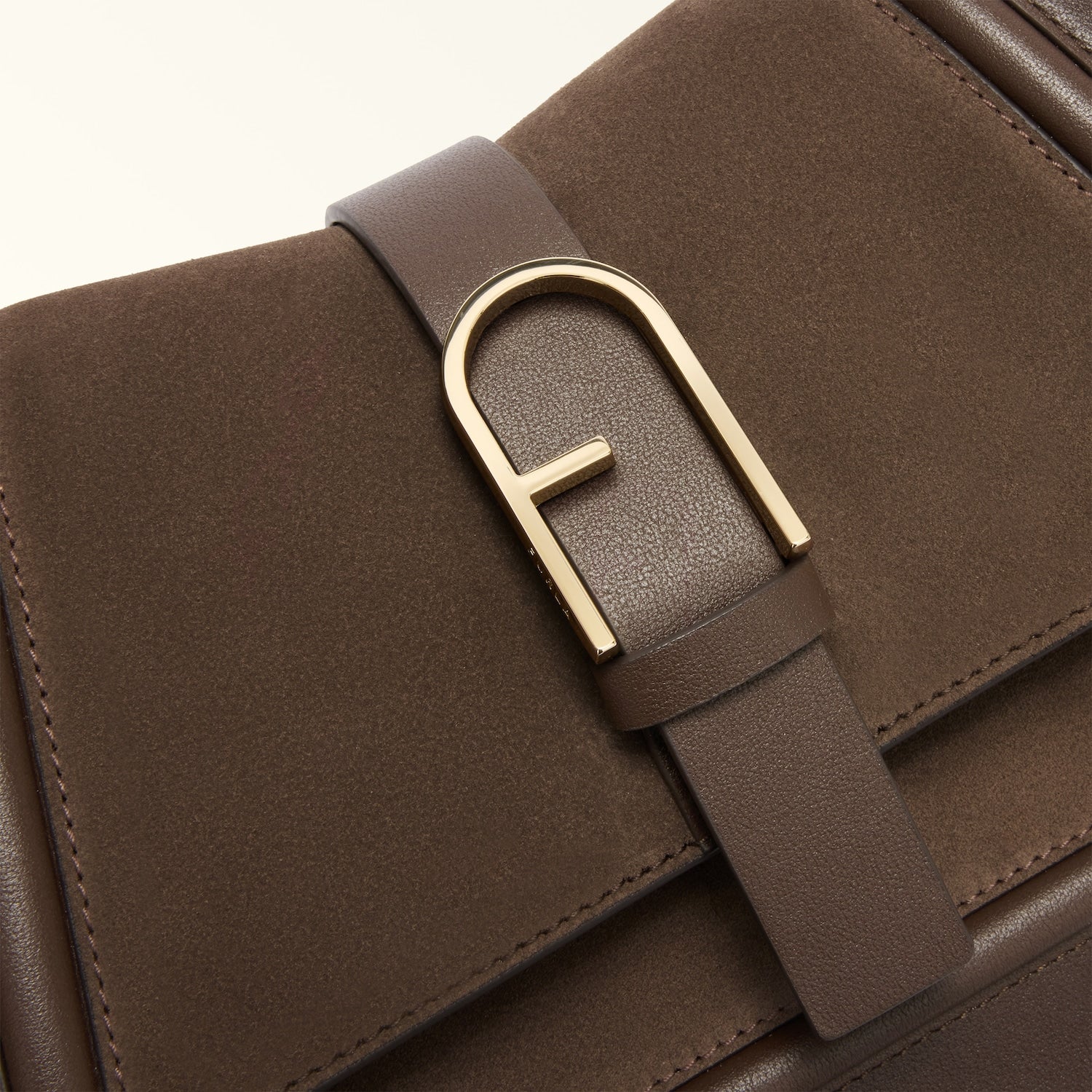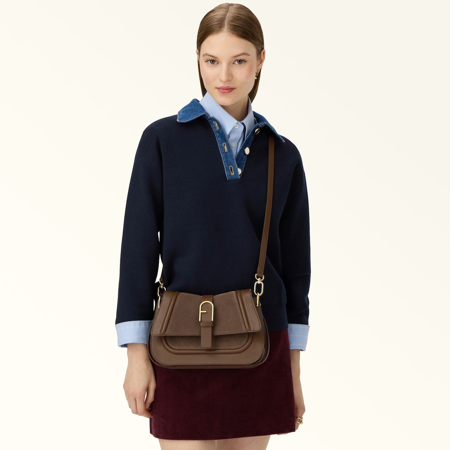 Versatile and compact, Furla Flow is the perfect pick for the winter season. Made of soft suede with smooth calfskin details, its design is elevated by a decorative logo buckle on the front flap closure. Its smooth trapezoidal silhouette with rounded lines keeps all your personal belongings safe and can be worn as a top-handle, crossbody or on-the-shoulder bag.