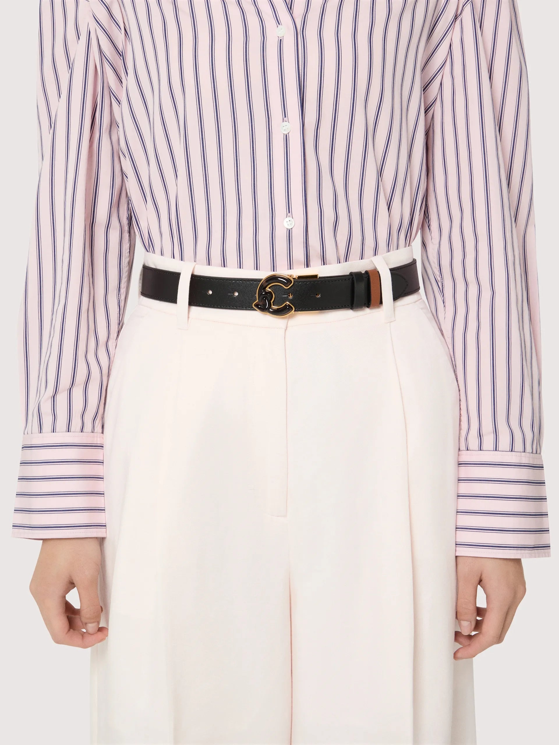 This belt from the C-Me line is enhanced by the logo reimagined with the C of Coccinelle, which knots around and embraces the plectrum, an iconic element of the brand. Its features include a reversible two-tone strap and a tortoiseshell-effect plexiglass C-Me buckle detail, ideal for pairing with any look. Reversible belt.